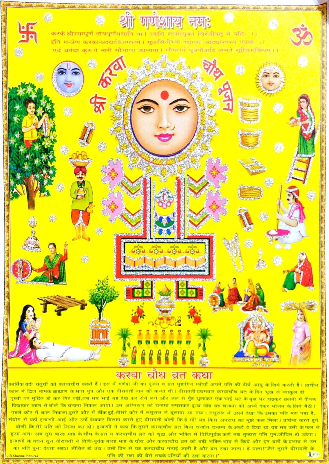 करवा चौथ के नाम के अनुसार करवा का अर्थ मिट्टी का बर्तन है। शाम को जब चांद निकलता है तब व्रत रखने वाली सुहागिनें करवा में पानी डालकर उस पानी में चन्द्रमा को देखती हैं। कार्तिक मास की पूर्णिमा के बाद की चौथी तिथि को करवा चौथ कहा जाता है। इस दिन सुहागिन औरत सीधे रूप में चन्द्रमा के दर्शन करना अशुभ समझती है। इसलिए प्रत्येक सुहागिन औरत करवा में पानी डालकर उसको छत के ऊपर रखकर उस पानी में या फिर छलनी से चन्द्रमा को देखती है। औरतें ऐसा क्यों करती हैं इस बारे में हमारी पुराण कथाओं के आधार पर एक कथा इस प्रकार है-