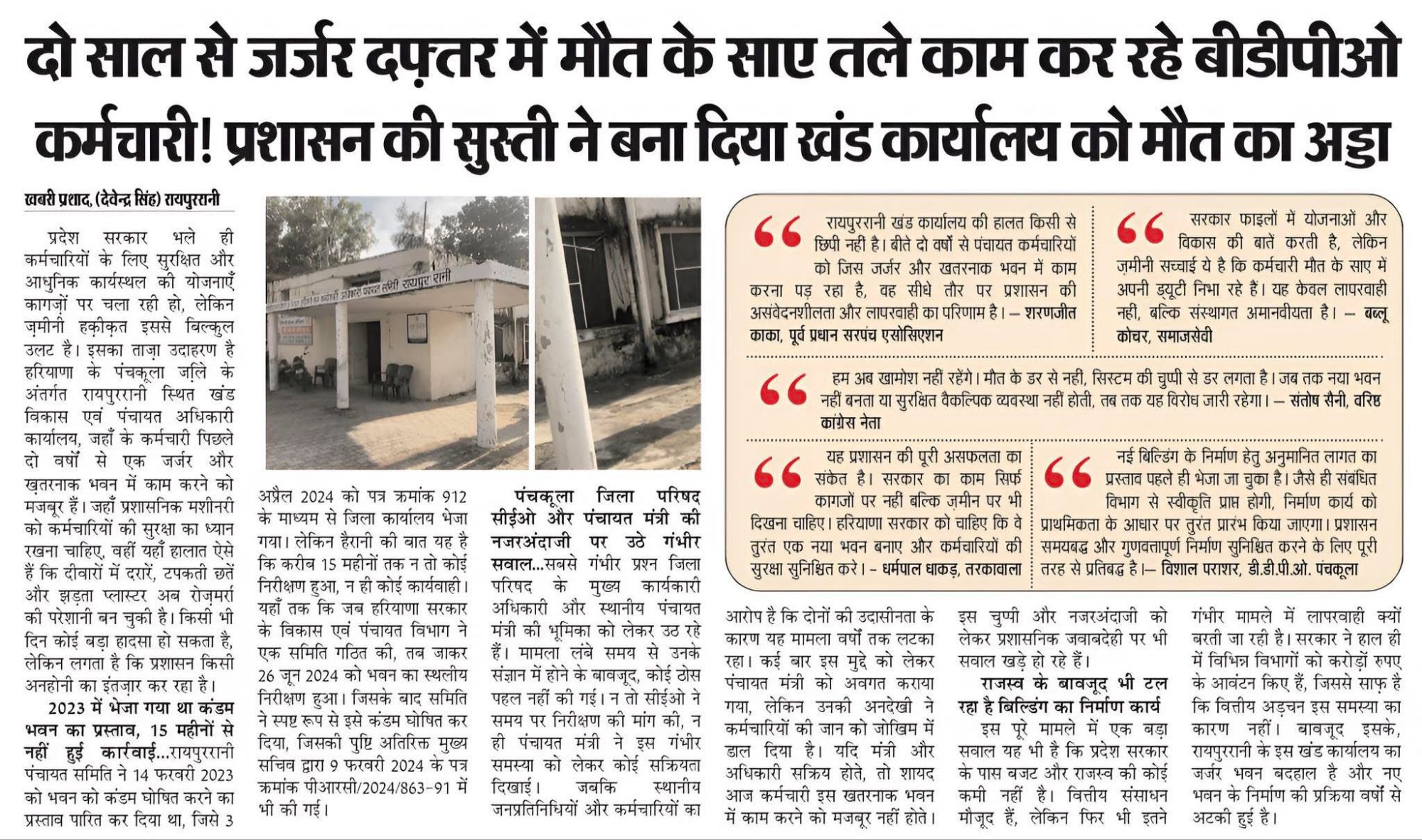 रायपुररानी पंचायत समिति ने 14 फरवरी 2023 को इस भवन को कंडम घोषित करने का प्रस्ताव पारित किया। इसके बाद 3 अप्रैल 2024 को यह प्रस्ताव जिला कार्यालय भेजा गया। लेकिन 15 महीनों तक न तो कोई निरीक्षण हुआ और न ही कोई कार्रवाई! हरियाणा सरकार के विकास और पंचायत विभाग ने एक समिति गठित की, लेकिन वह भी 26 जून 2024 को जाकर भवन का स्थलीय निरीक्षण करने पहुंची। तब जाकर समिति ने इस भवन को कंडम घोषित कर दिया, जिसकी पुष्टि अतिरिक्त मुख्य सचिव ने 9 फरवरी 2024 के पत्र में भी की थी। फिर भी, हालात जस के तस हैं और कर्मचारी अपनी जान जोखिम में डालकर काम कर रहे हैं।