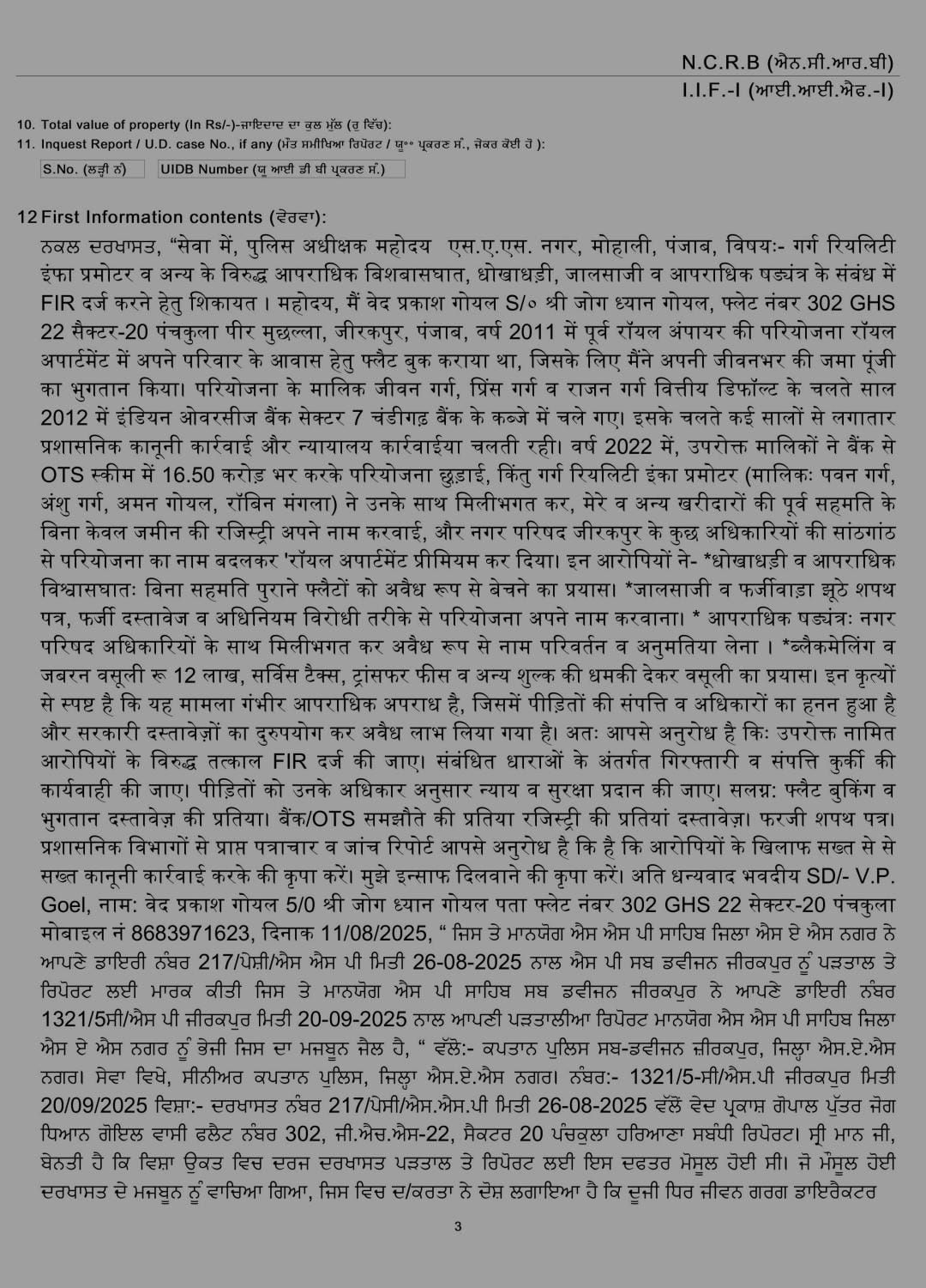 पंजाब के मोहाली जिले के जीरकपुर कस्बे के पीर मुछल्ला क्षेत्र में स्थित रॉयल अपार्टमेंट प्रीमियम प्रोजेक्ट को लेकर अब एक नई शिकायत दर्ज की गई है। ढकोली थाना क्षेत्र में दर्ज इस FIR में गंभीर आरोप लगाए गए हैं। शिकायतकर्ता का आरोप है कि फ्लैट बुकिंग और भुगतान के बावजूद उसे अब तक मकान नहीं दिया गया।